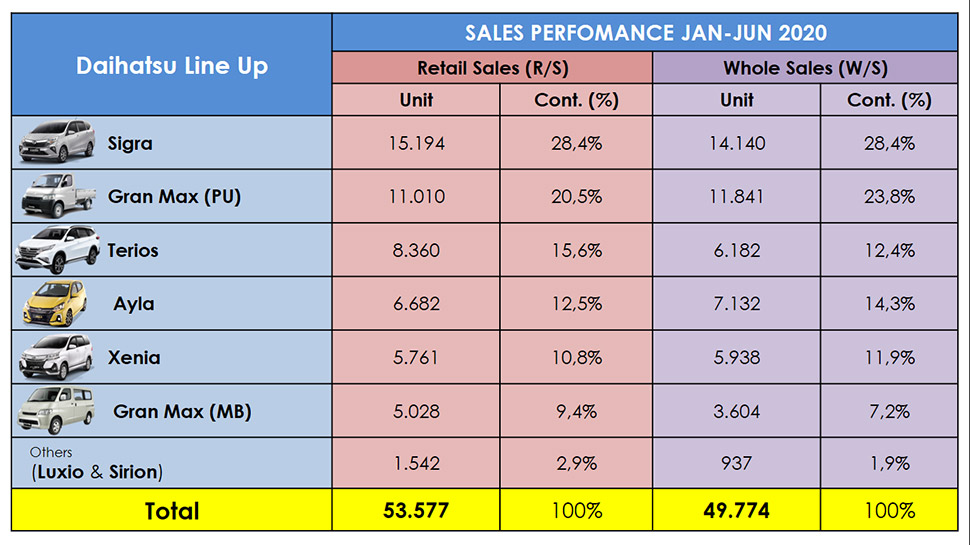 Secara nasional, penjualan retail pasar otomotif Indonesia selama periode Januari – Juni 2020 mencapai sekitar 290 ribu unit, atau turun 42% dibandingkan periode yang sama pada tahun 2019. Sementara itu, penjualan retail Daihatsu mencapai 53.577 unit, turun 39% dari tahun lalu. Performa ini lebih baik daripada penurunan pasar nasional sehingga market share Daihatsu mengalami kenaikan sebesar 0.8% dari 17.6% YTD Juni 2019 menjadi 18.4% YTD Juni 2020.